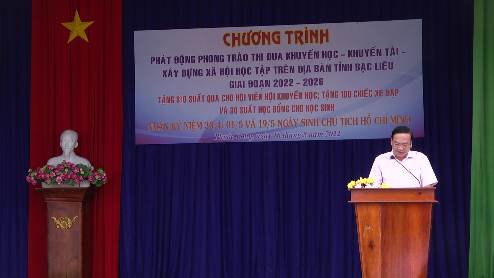 Nhân kỷ niệm 132 năm ngày sinh Chủ tịch Hồ Chí Minh, ngày 16/5, Hội Khuyến học tỉnh Bạc Liêu phối hợp với UBND huyện Phước Long, tổ chức lễ phát động phong trào thi đua khuyến học- khuyến tài- xây dựng xã hội học tập trên địa bàn tỉnh, giai đoạn 2022- 2026. Đến dự, về phía tỉnh, có các đồng chí Nguyên là lãnh đạo Tỉnh uỷ- HĐND tỉnh- UBND tỉnh qua các thời kỳ, đồng chí Trần Hoàng Duyên, Chủ tịch Hội Khuyến học tỉnh; cùng lãnh đạo một số Sở, ngành tỉnh. Về phía huyện, có đồng chí Nguyễn Chí Thiện, Uỷ viên Ban Thường vụ Tỉnh uỷ, Bí thư Huyện uỷ, Chủ tịch HĐND huyện; đồng chí Lê Văn Tần, Chủ tịch UBND huyện, cùng đại diện lãnh đạo các cơ quan, ban, ngành, đoàn thể huyện và đông đảo bà con, học sinh trên địa bàn huyện tham gia.