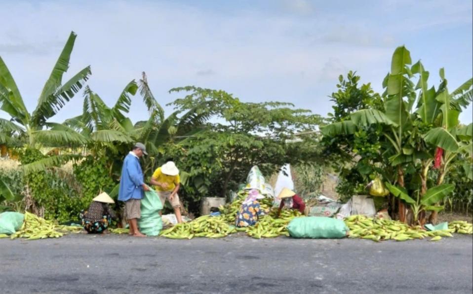 Nông dân xã Vĩnh Phú Đông, huyện Phước Long thu hoạch và vận chuyển bắp nếp