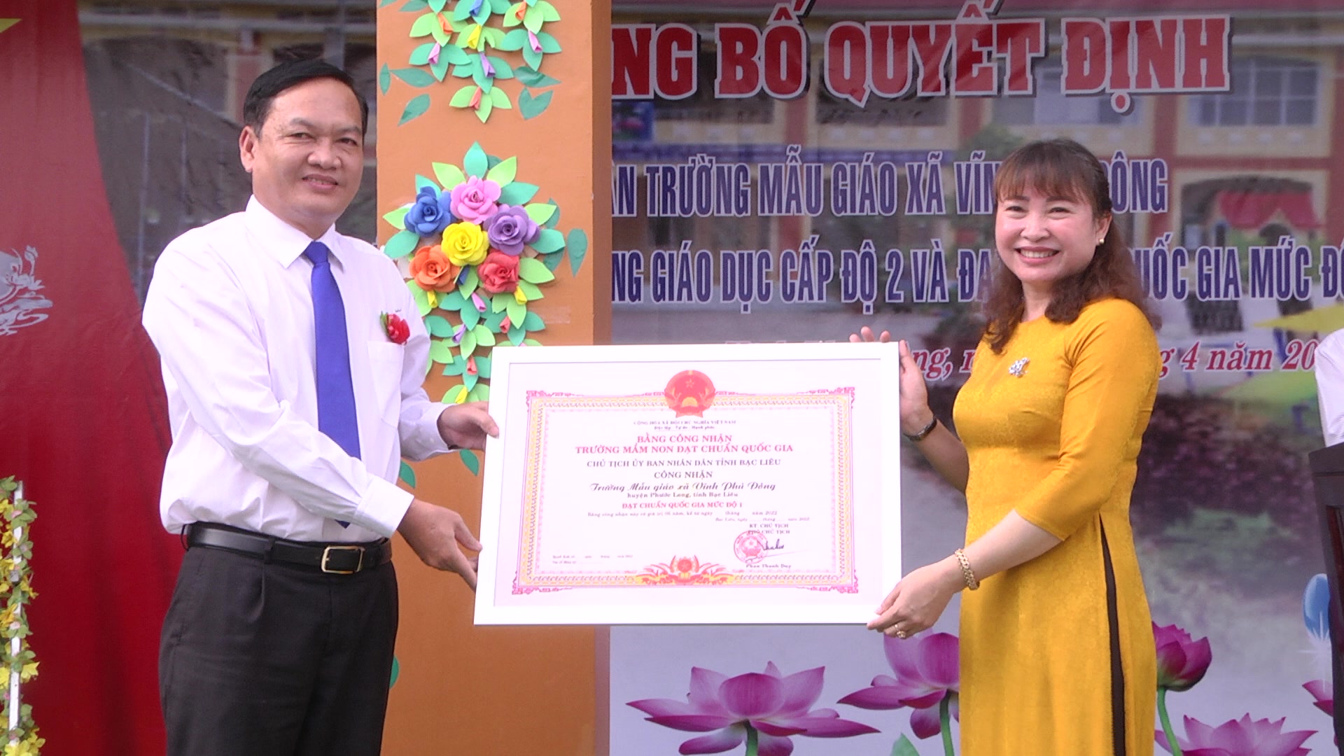 null Trường Mẫu giáo xã Vĩnh Phú Đông đón nhận bằng công nhận trường đạt chuẩn Quốc gia mức độ 1